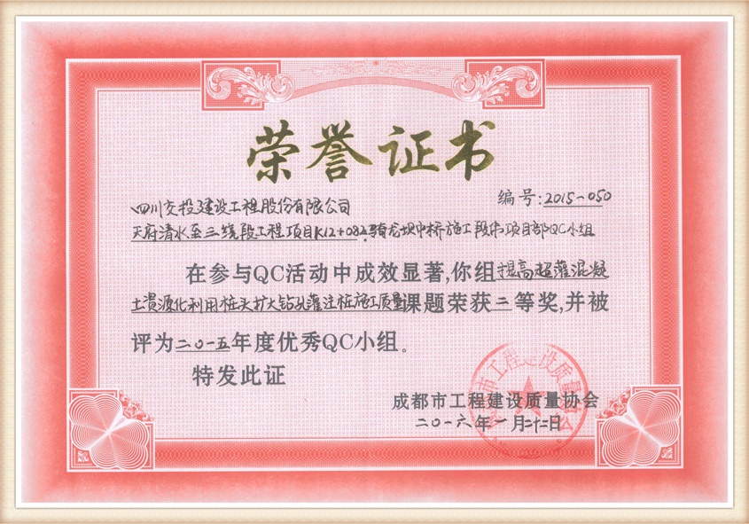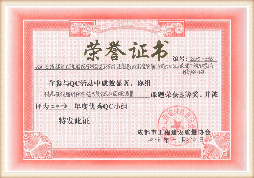 提高現(xiàn)役留用橋QC獎狀樁臺復(fù)合式加固施工質(zhì)量QC獎狀