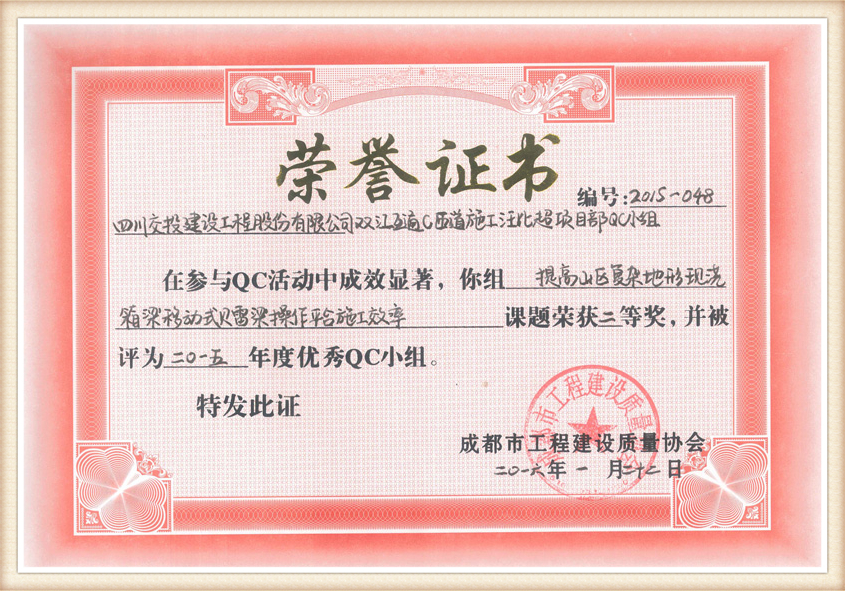提高山區(qū)復(fù)雜地形現(xiàn)澆箱梁移動式貝雷梁操作平臺施工效率QC獎狀