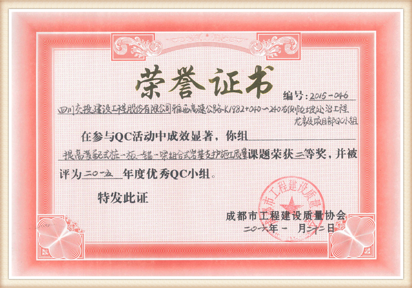 提高裝配式樁一板一錨一梁組合式巖基支護施工質(zhì)量QC獎狀