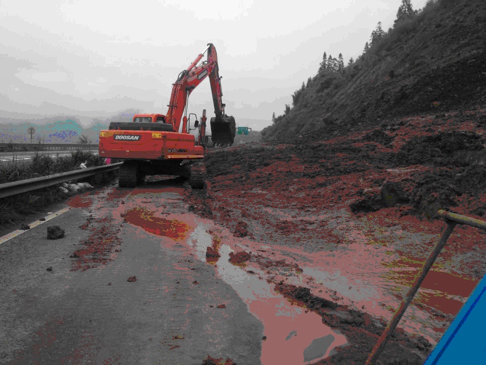 2014年6月21日,雅西高速公路受暴雨的影響,K1982+150~200右側(cè)邊坡垮塌,約一萬多立方的泥石流涌入公路,中斷了交通,造成雅瀘路K1982+150處右幅道路癱瘓。養(yǎng)護分公司領(lǐng)導(dǎo)對此高度重視,立即啟動應(yīng)急機制,組織人員、機械設(shè)備進場施工。由于塌方量大,加上持續(xù)降雨,使清方工作難度增加。為盡快搶通道路,保證高速公路行車安全,作業(yè)人員冒著邊坡可能繼續(xù)垮塌的危險施工,加班加點,不顧疲勞,經(jīng)過三天的艱苦奮戰(zhàn),終將路面堆積的垮塌土石方清理完畢,順利完成了第一階段的搶險任務(wù),保障了道路的暢通。