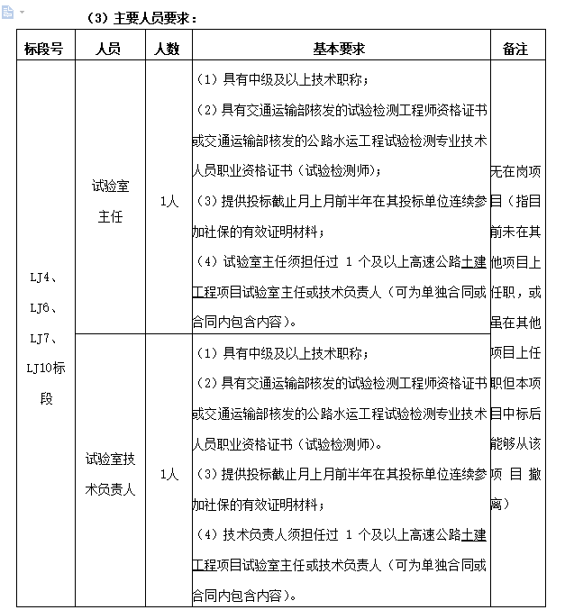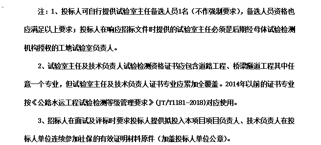 投標(biāo)人可提供備選試驗(yàn)室主任(面試通過)1名,但不作強(qiáng)制要求。未通過或未參與現(xiàn)場考核的主要人員,不得在本項(xiàng)目擔(dān)任職務(wù)。如果在評標(biāo)過程中發(fā)現(xiàn)投標(biāo)人投標(biāo)文件中擬投入本項(xiàng)目試驗(yàn)室主任(含備選)和技術(shù)負(fù)責(zé)人與面試人員不一致,直接按無效投標(biāo)處理。