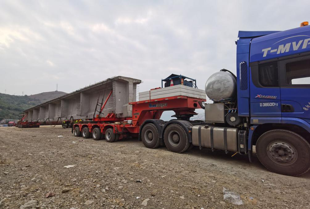 據(jù)了解,本次搶險工程需要恢復(fù)的梁板為右幅第1孔、第2孔、第3孔,每孔5片梁,共計15片梁,其中邊梁6片,中梁9片;邊梁頂板寬度為2.025m,主梁43.06m3,橫隔板2.65m3,合計45.71m3,約121.5T;中梁頂板寬度為1.8m,主梁41.44m3,橫隔板5.3m3,合計46.74m3,約121.5T。由于制梁區(qū)距離施工現(xiàn)場約60.3km,運(yùn)輸?shù)缆窏l件有限且相距甚遠(yuǎn)、交通流量大,為確保運(yùn)梁速度及行車安全,承建項(xiàng)目部計劃分5天進(jìn)行,每天運(yùn)輸3片,并調(diào)用3臺液壓軸線板運(yùn)梁車保證運(yùn)輸速度與安全,同時指派專人全程負(fù)責(zé)協(xié)調(diào)所有運(yùn)輸環(huán)節(jié)。