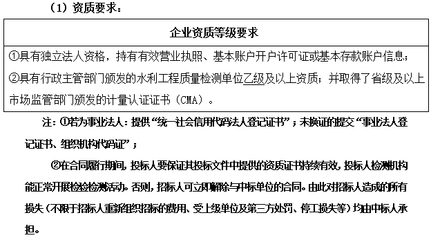 3.6 特殊資格要求:投標(biāo)人為招標(biāo)人資信庫成員(水利工程質(zhì)量檢測類)。